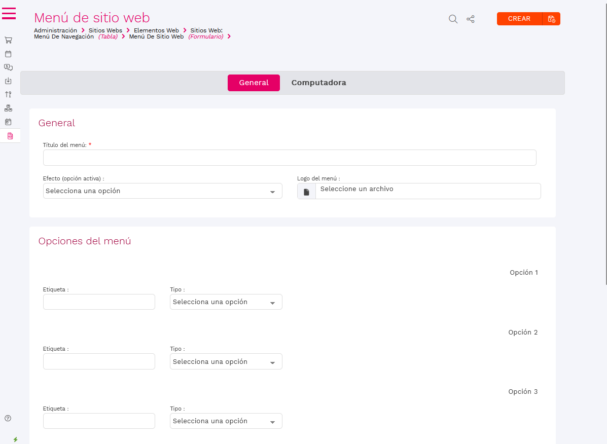 Los menús permiten hasta seis opciones principales, cada una con una etiqueta y un tipo de destino. La etiqueta es el texto que aparecerá en el menú, mientras que el tipo define a dónde redirigirá esa opción. Puedes elegir entre:salto_linea- Una página interna (seleccionas la página desde el sistema). salto_linea- Una URL externa (escribes directamente la dirección web).salto_linea- Enlaces a módulos específicos como la tienda virtual, el blog o la página de contacto.salto_lineaRellena estas opciones según sea necesario, teniendo en cuenta que el límite máximo son seis elementos por menú.