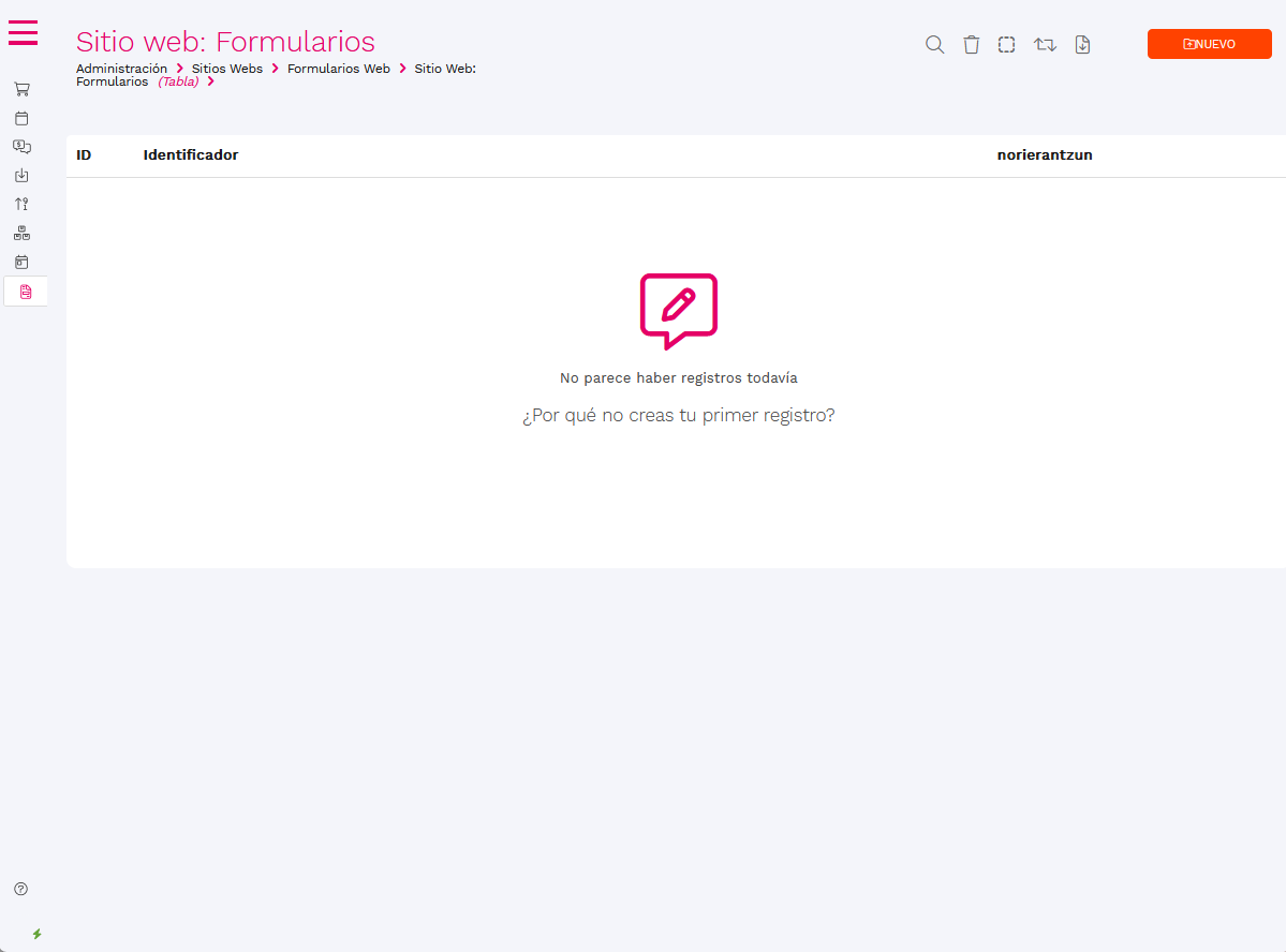 Para crear un formulario en Zendha Core, accede al módulo de Comunicación, selecciona Formularios Web y haz clic nuevamente en Formularios Web. Aquí podrás ver una lista de formularios existentes o, si es la primera vez, comenzar creando uno nuevo pulsando el botón Nuevo.