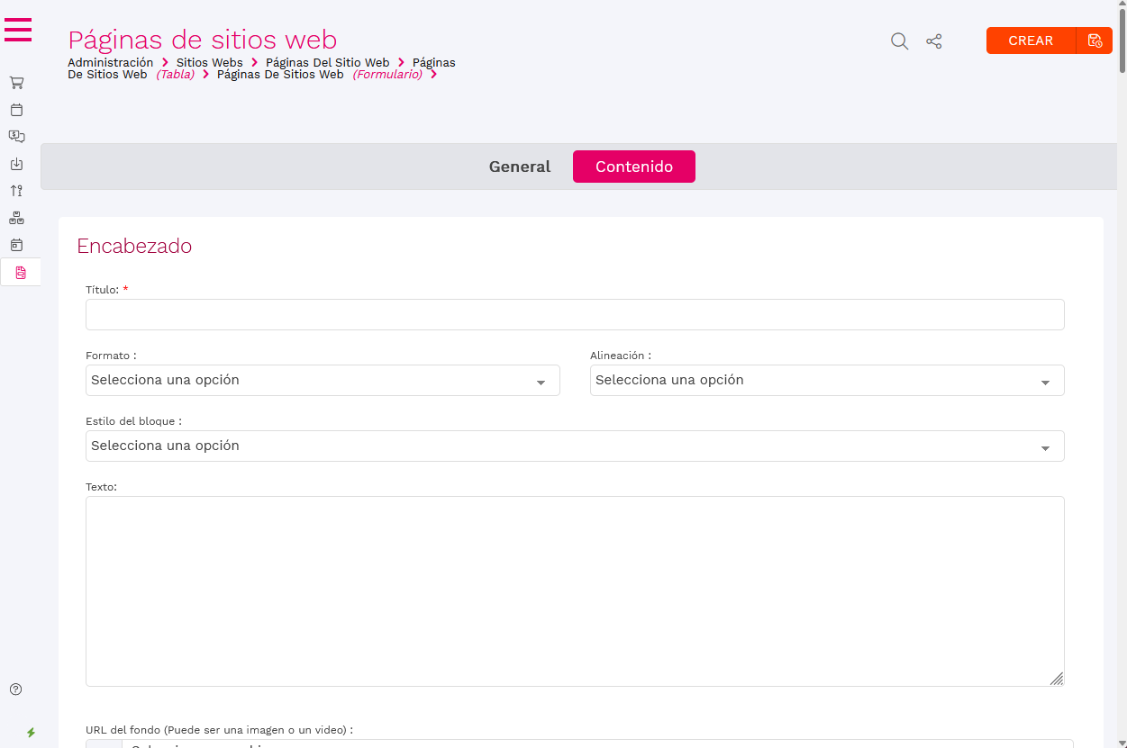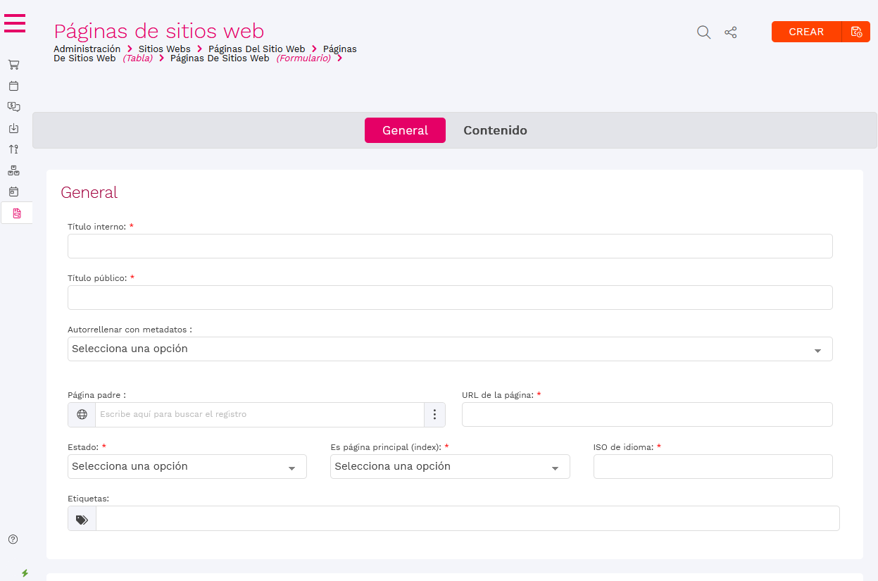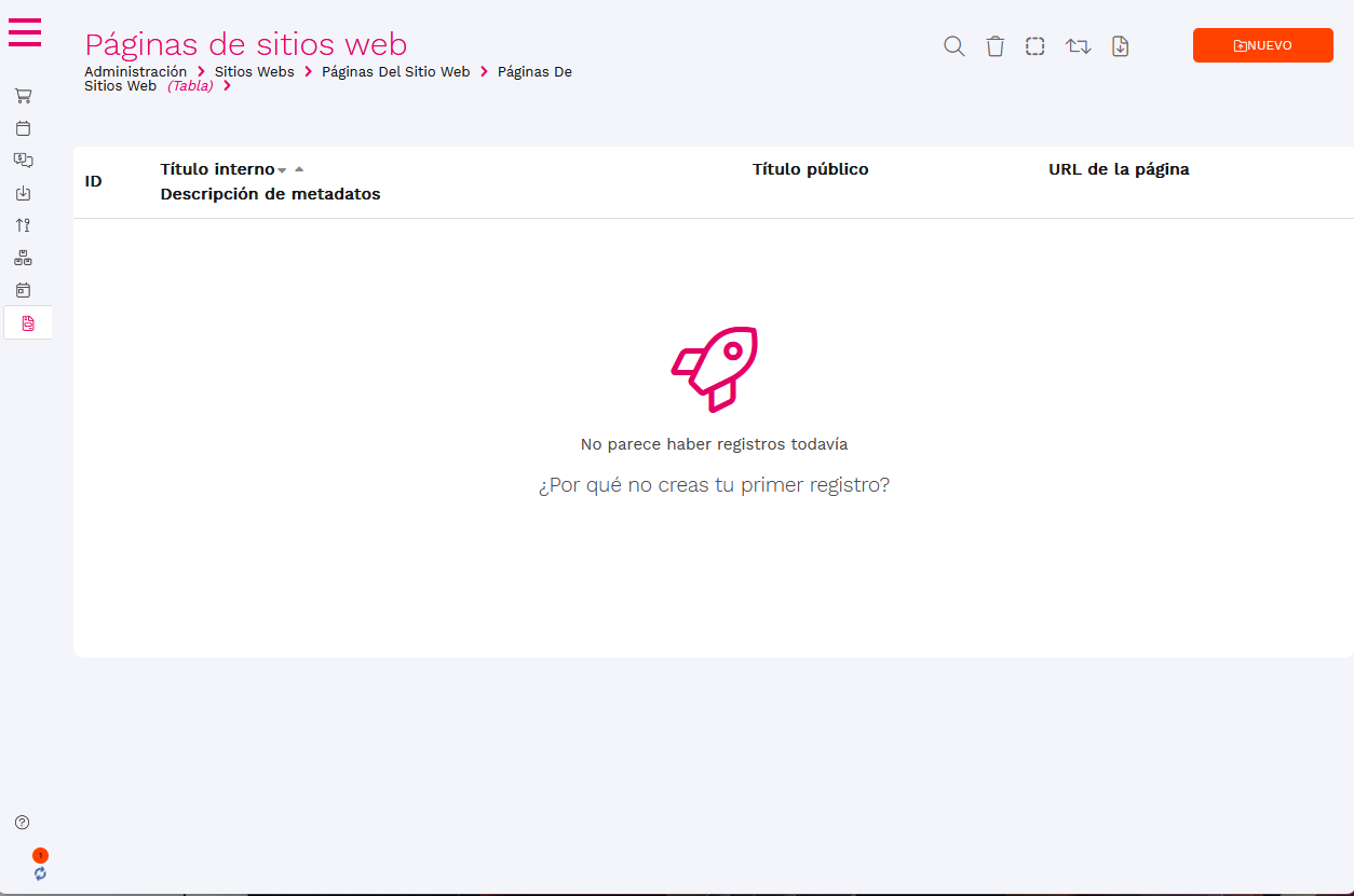 Para comenzar, accede al módulo de Comunicación, selecciona Páginas del sitio web y haz clic nuevamente en Páginas del sitio web. Esto te llevará a una tabla donde aparecerán todas las páginas creadas. Si estás empezando, la tabla estará vacía. Para crear una nueva página, pulsa en Nuevo.