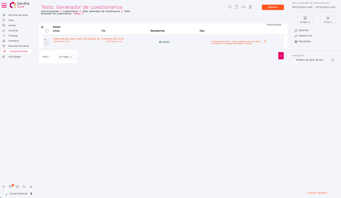 Vamos a Comunicaciones > Cuestionarios > Generador de test, se abrirá la lista con los test generados anteriormente, damos clic al que queremos revisar para que abra el menú de navegación y pulsamos en 'Resultados'.