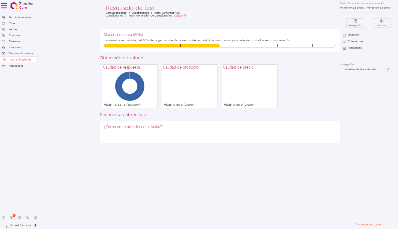 Esto nos mostrará las categorías y preguntas que colocamos en nuestro test, gráficas para calidad, ver cuántos usuarios han respondido, y mucha más información.