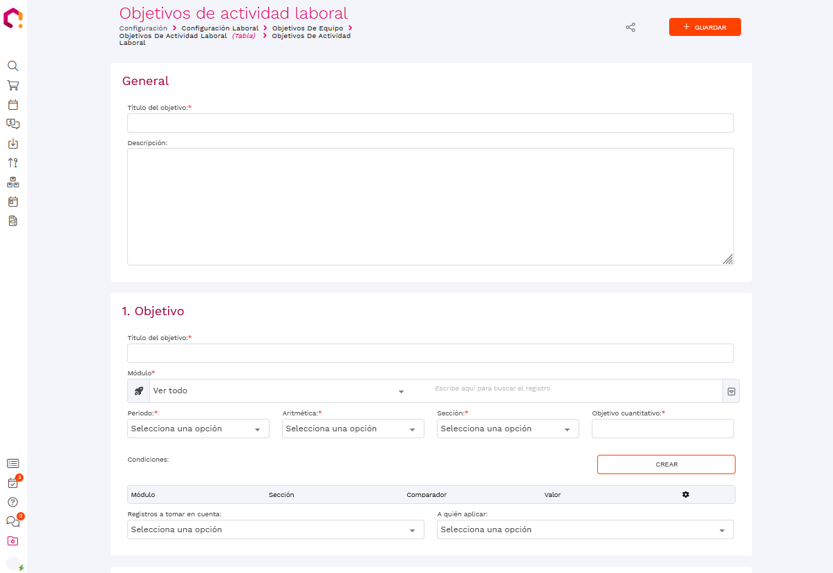 Dentro de los objetivos podemos agregar una especie de sub-objetivos. Estos son los que se mostrarán de forma pública. salto_lineaMódulo: Recomendamos buscar desde la barra de la derecha. Es el módulo donde se aplicará este objetivo.salto_linea- Periodo: Cada cuándo debe cumplirse este objetivo.salto_linea- Aritmética: Si cuenta o se añade al periodo.salto_linea- Sección: Por ahora dejaremos la opción que nos permita. salto_linea- Objetivo cuantitativo: Cantidad necesaria para considerar alcanzado el objetivo. salto_linea- Botón crear: Es para agregar condiciones más específicas.salto_linea- Registros a tomar en cuenta: Qué registros cuentan para el objetivo. salto_linea- A quién aplicar: A quién aplica este objetivo.
