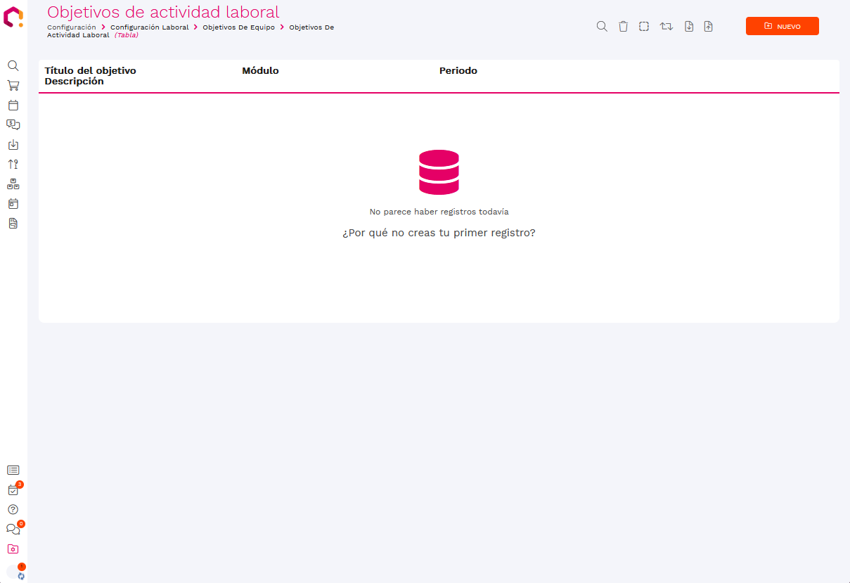 Para empezar, accede al menú de Configuraciones, luego a Configuración Laboral y selecciona Objetivos de Equipo. Desde aquí puedes crear un nuevo modelo de objetivos que servirá como base para asignarlo posteriormente a empleados o equipos.