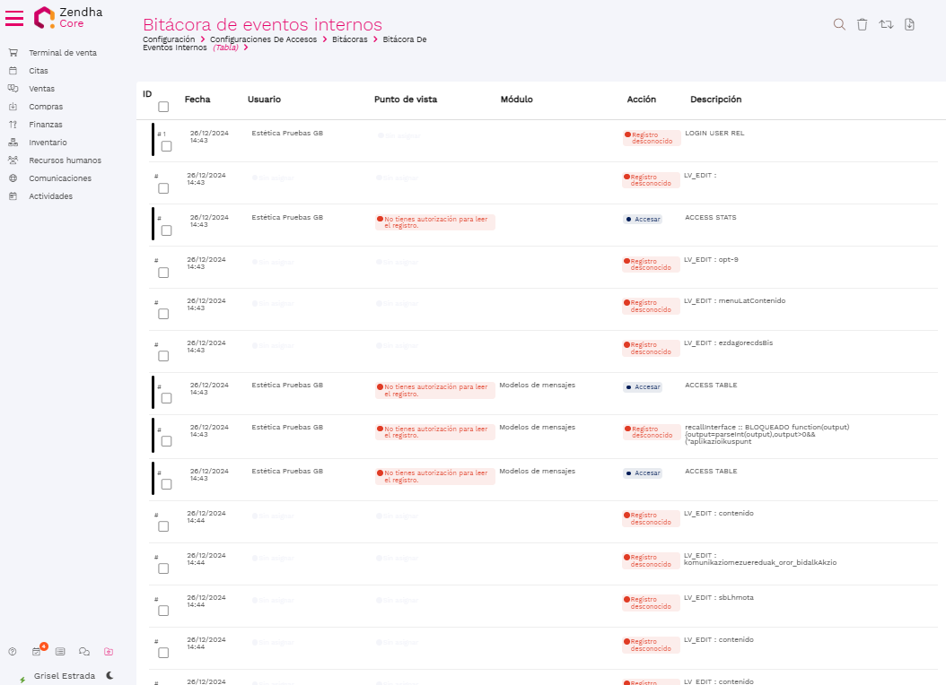 La capacidad de analizar las actividades de los usuarios en Zendha Core es fundamental para garantizar un control exhaustivo de las operaciones realizadas dentro del sistema. Cada acción, desde accesos hasta ediciones o eliminaciones, queda registrada y disponible para su revisión, lo que facilita el seguimiento de las actividades y la identificación de responsables.
