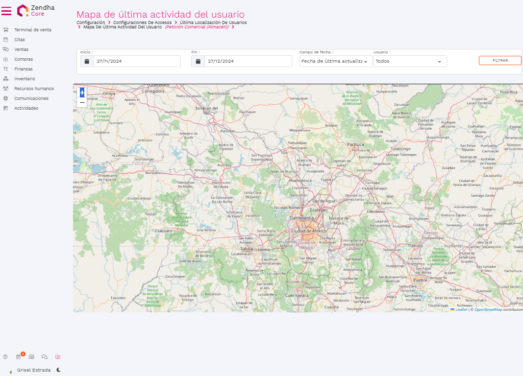Zendha Core también ofrece la opción de rastrear la localización geográfica desde donde se realizan las acciones. Esto nos ayuda con la verificación de ubicaciones por usuario. Para acceder a la vista es en Configuración > Configuraciones de acceso > Última localización de usuario.