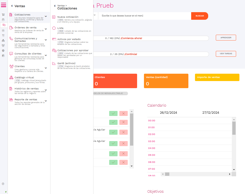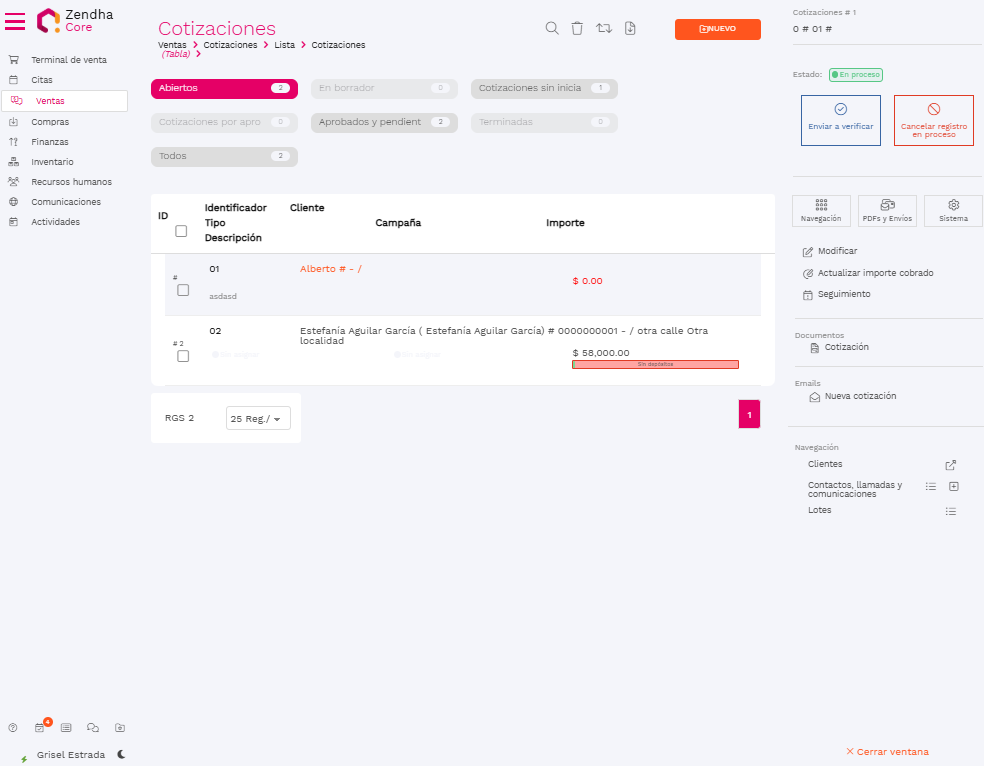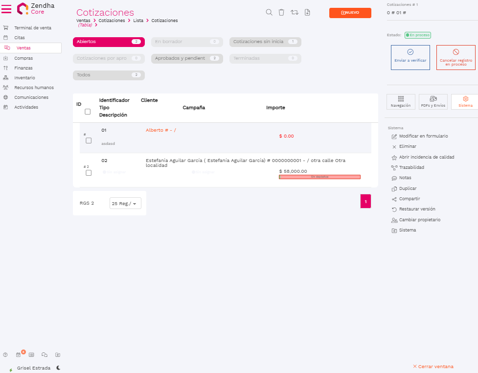 Dentro de esta vista donde tendremos las cotizaciones realizadas, tendremos que seleccionar alguna a la que queramos agregar alguna incidencia de calidad para abrir el menú de navegación. Dentro de éste pulsaremos en 'Sistema'
