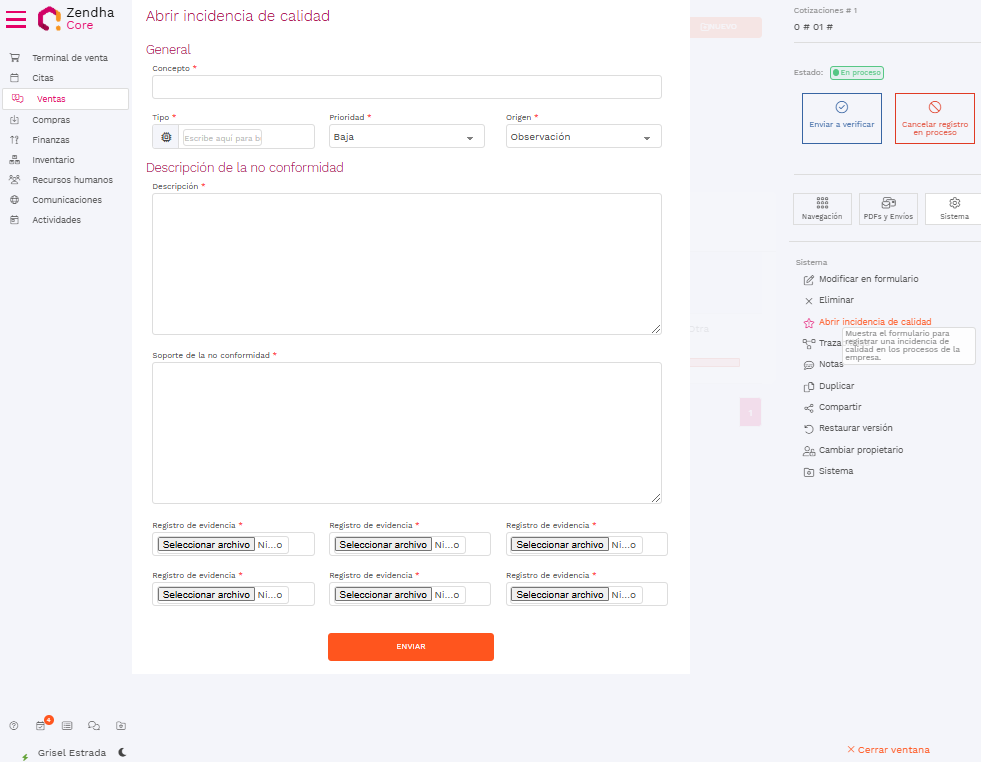 Encontraremos unos campos a rellenar como el concepto o motivo de la incidencia, el tipo de incidencia (esta la debemos tener previamente preparada, el sitio para asignar es dentro de Rrecursos humanos > calidad y análisis > Categorías de calidad), elegimos tipo de prioridad, el origen (interna, externa, queja de cliente), o solo una observación. Además de espacios para describir todo lo que necesitemos y poder agregar evidencias en caso de algún archivo adjunto. Una vez terminemos, daremos a 'Enviar' y listo.