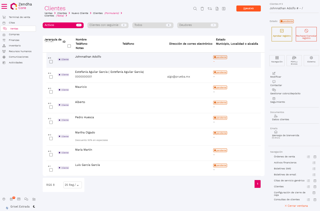 Al seleccionar un registro, se abre un panel a la derecha con opciones para ver más detalles, editar o agregar información. También encontrarás botones como “guardar” o “nuevo” en la parte superior para trabajar sin salir de esa pantalla.