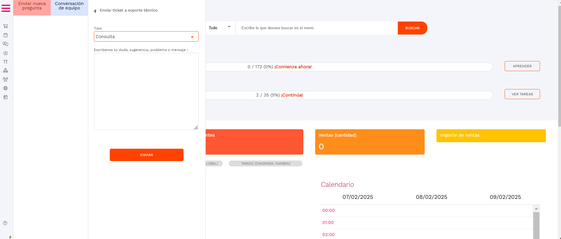 El botón de la izquierda lo liga a nuestro soporte técnico y puede enviar un tícket con un asunto particular eligiendo una de las opciones de 'Tipo' (sin definir, error, sugerencia, o consulta)