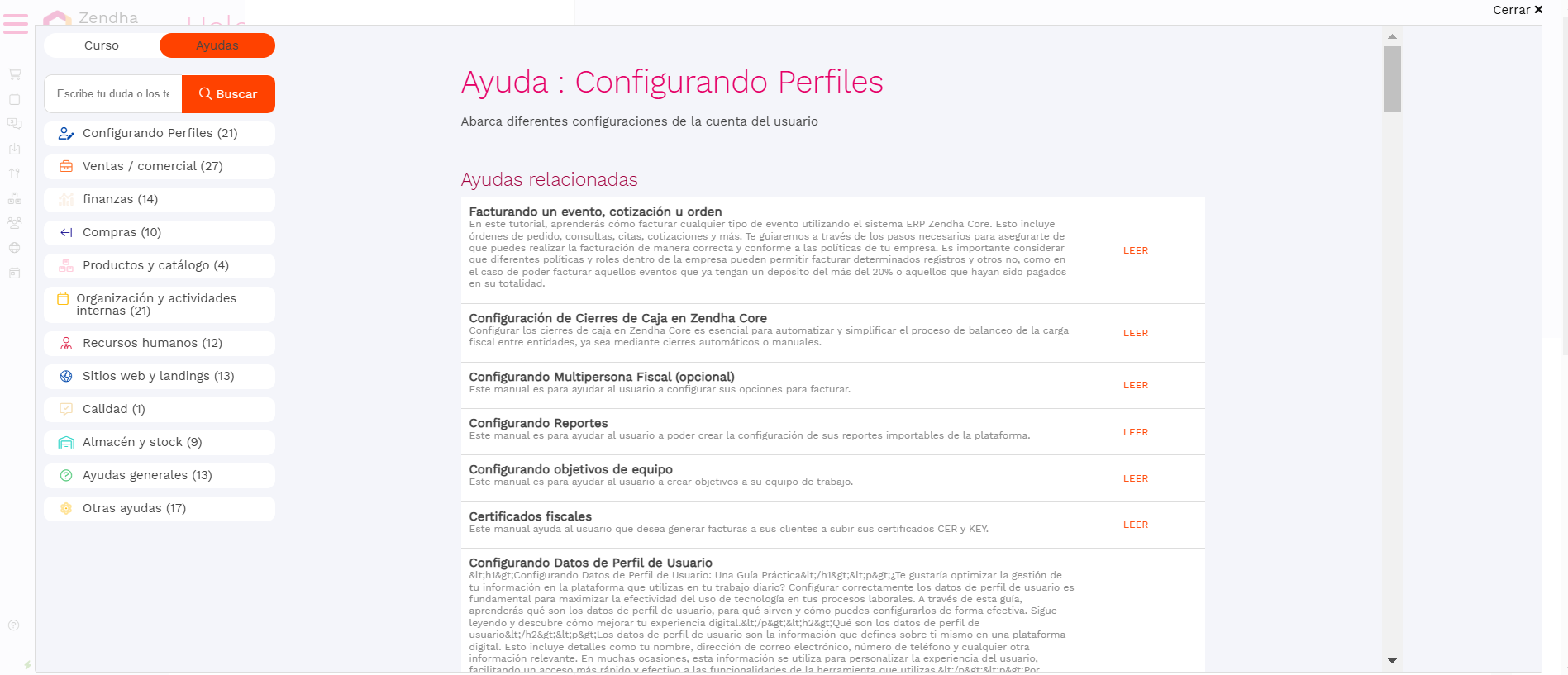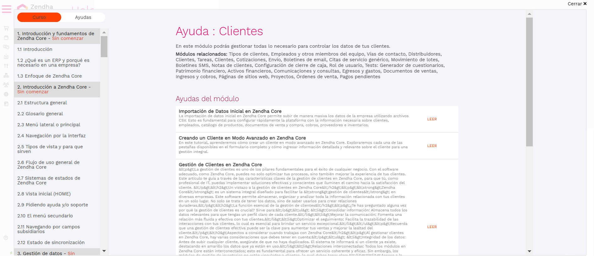 Dentro de Ayuda encontraremos dos botones en la parte superior. El primero nos abrirá el curso Zendha Core de manera automática donde podremos buscar por título de los manuales.
