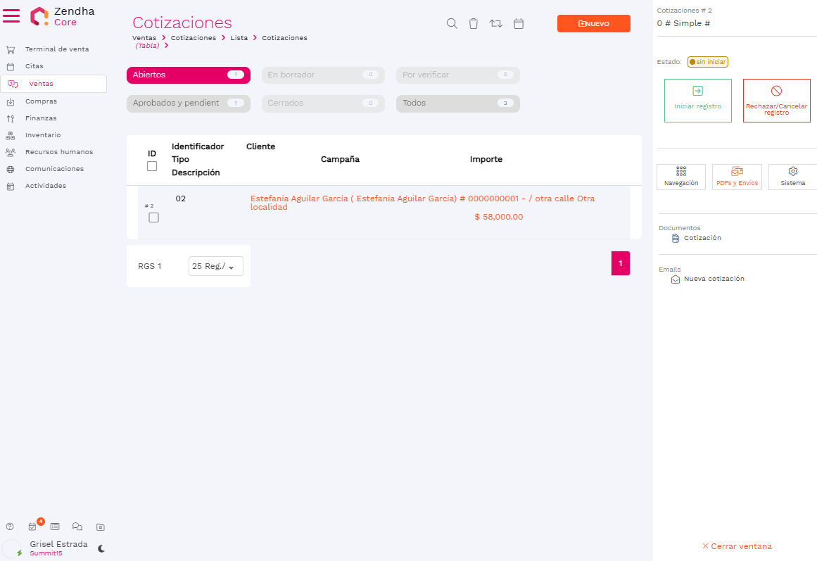 Cuando lo tengamos daremos a guardar. Haremos esto con cada documentos que deseemos aplicar por módulo, por lo que si acabamos de crear una cotización, iremos a Cotizaciones (Ventas > Cotizaciones > Lista). Aquí seleccionamos un registro para abrir el menú de navegación derecho y poder presionar el botón 'PDFs y envíos'