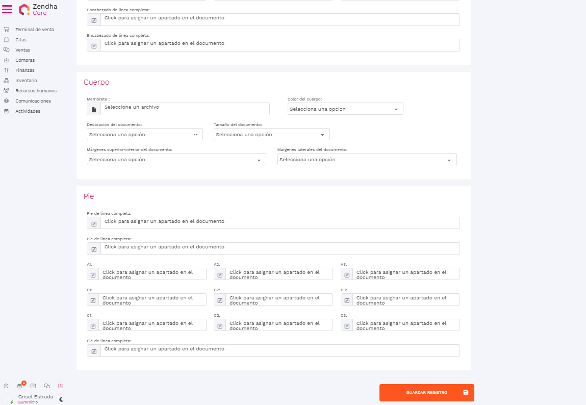 En este bloque podemos subir el membrete de nuestra empresa en formato PNG sin fondo, el color de fondo, y otros elementos para decorar tu documento.