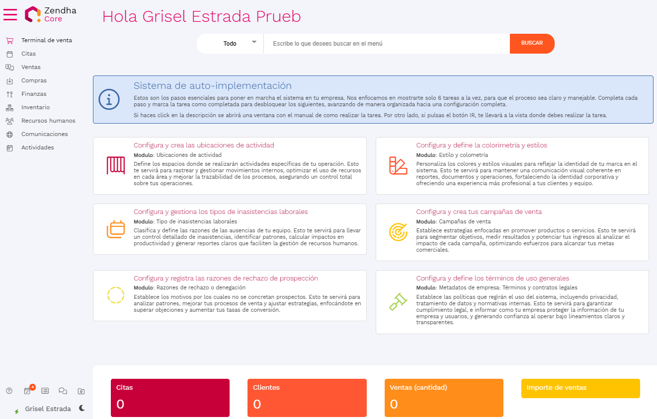 La interfaz de Zendha Core está diseñada para apoyar la gestión diaria de manera ordenada y eficiente. Cada módulo agrupa funciones específicas que te permiten acceder rápidamente a las herramientas necesarias y adaptarlas según el funcionamiento de tu área o equipo.