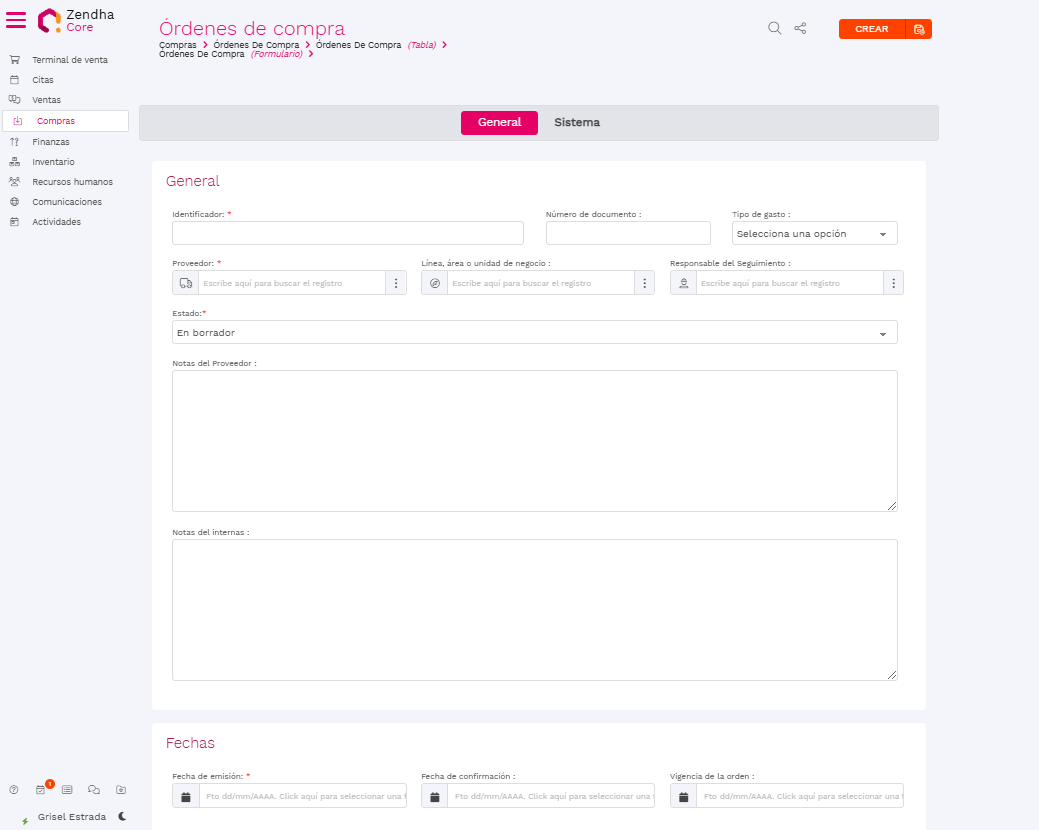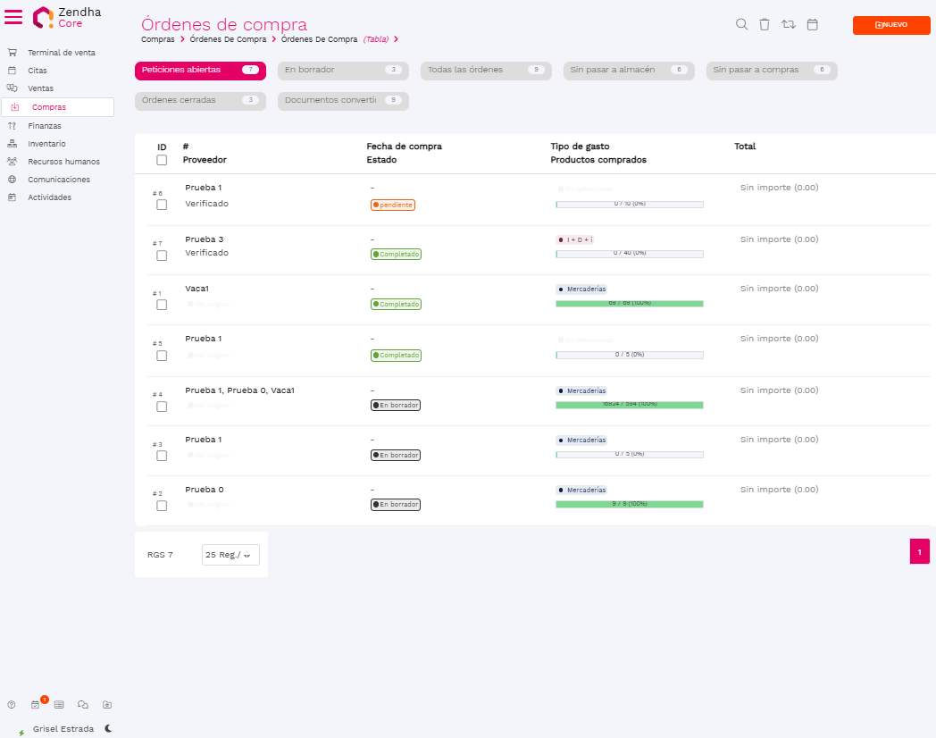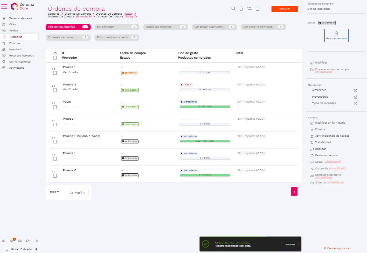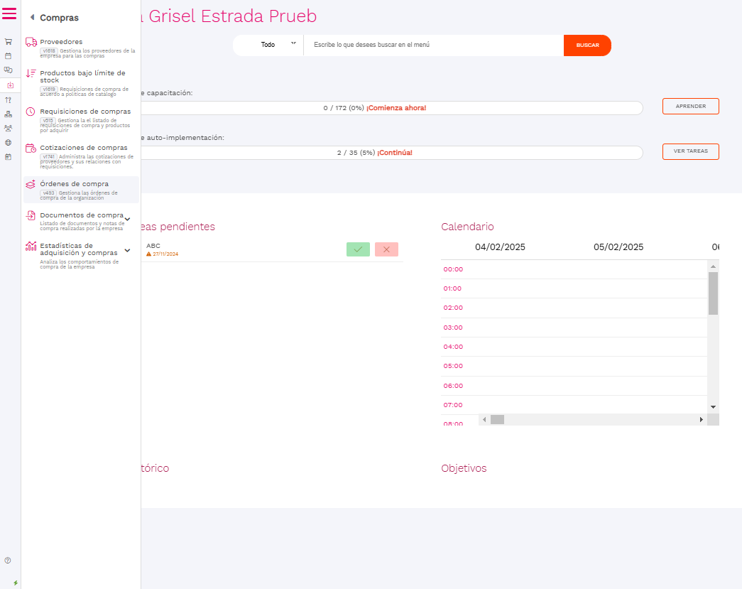 Vamos a localizar el menú principal o lateral. Veremos los módulos de la organización. Para el ejemplo iremos a las Órdenes de compras, dentro de Compras.