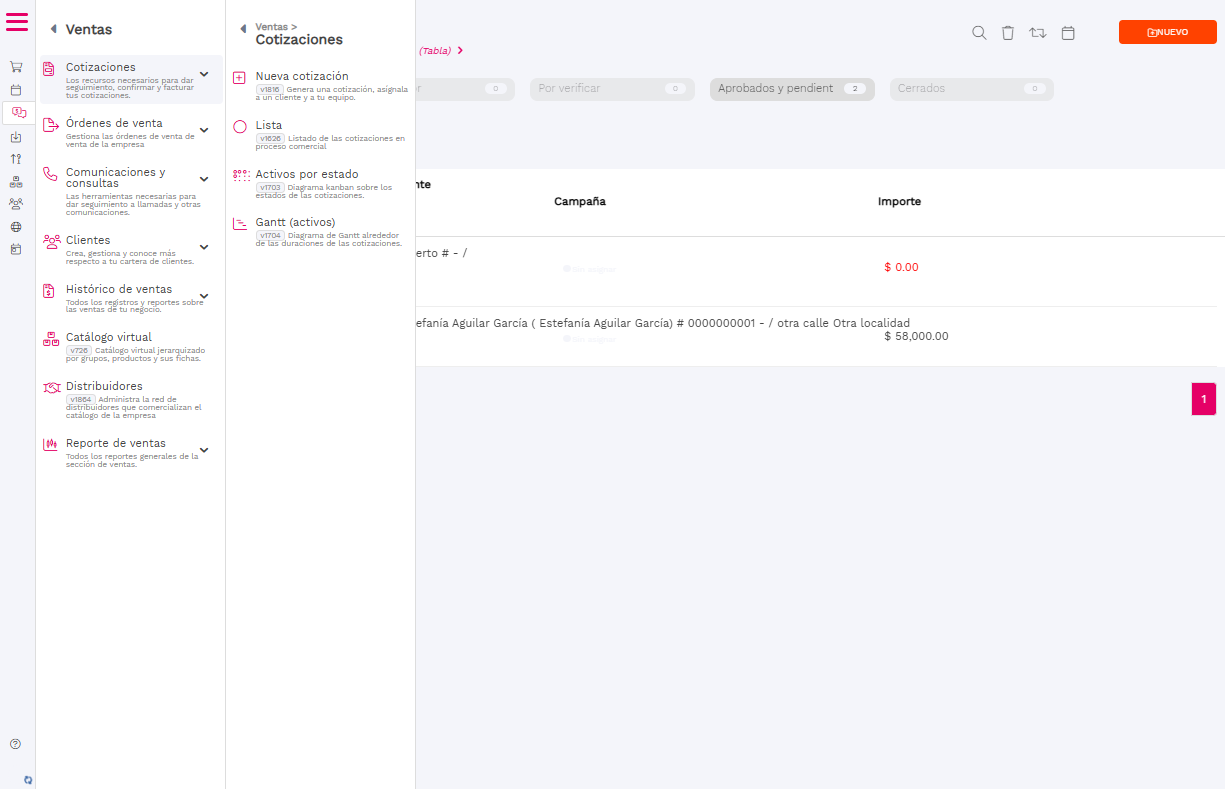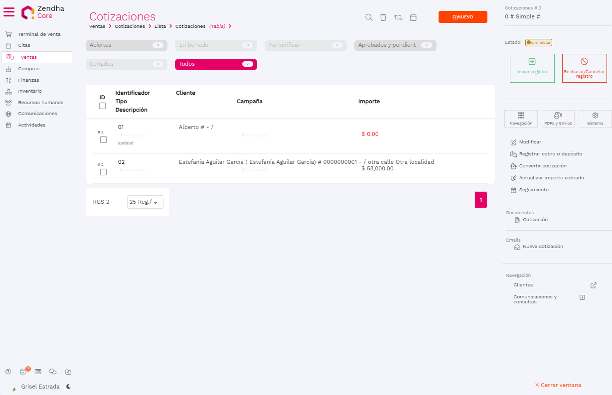 Ahora, si vamos a la lista de las cotizaciones, veremos que en la parte superior hay pestañas que organicen las cotizaciones abiertas, en borrador, etc. A su vez, si damos clic a un registro, se abrirá el menú de navegación lateral y veremos que está el estado de la cotización y unos cuadros para realizar las siguientes acciones.