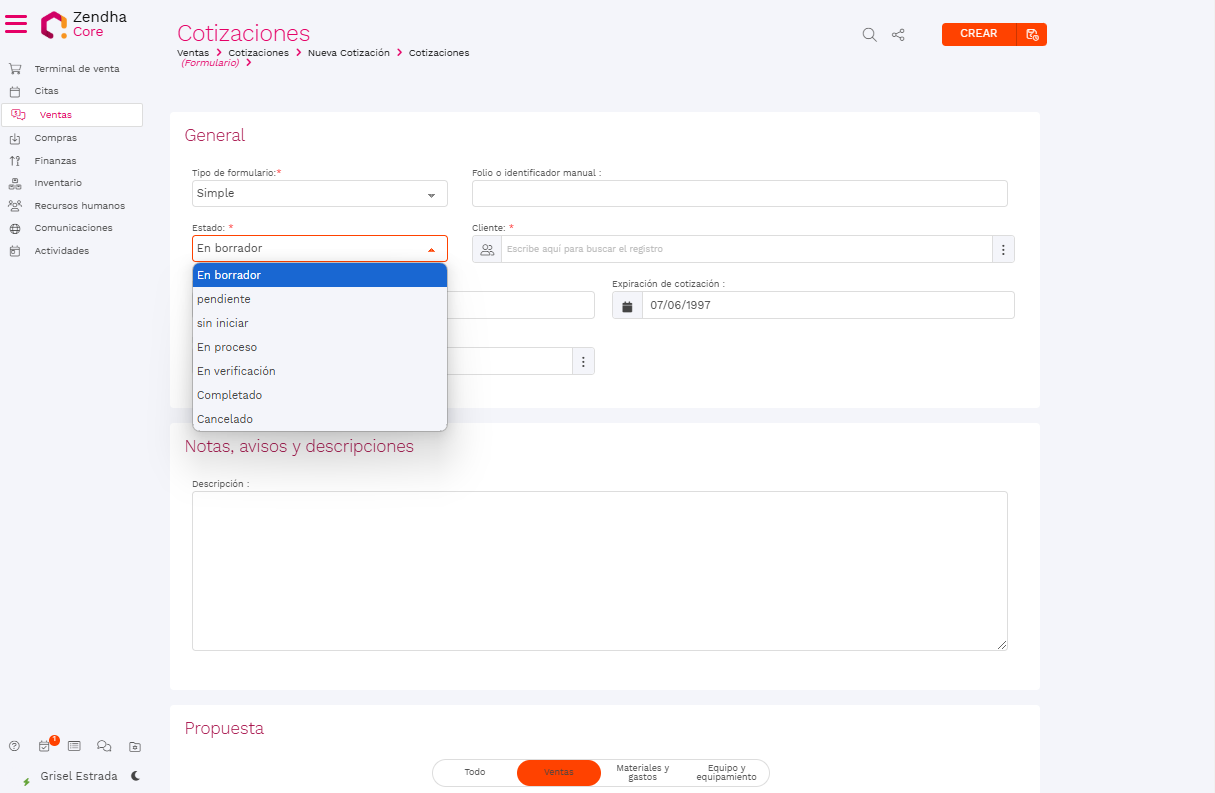 Los sistemas de estados se refieren a los pasos que tenemos en nuestros procesos en los registros. Para explorarlos iremos a un formulario, para este ejemplo usaremos Cotizaciones (ventas > Cotizaciones > Nueva cotización).
