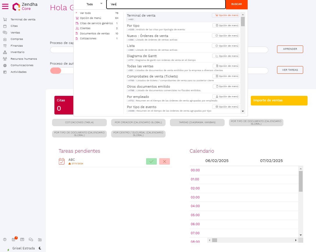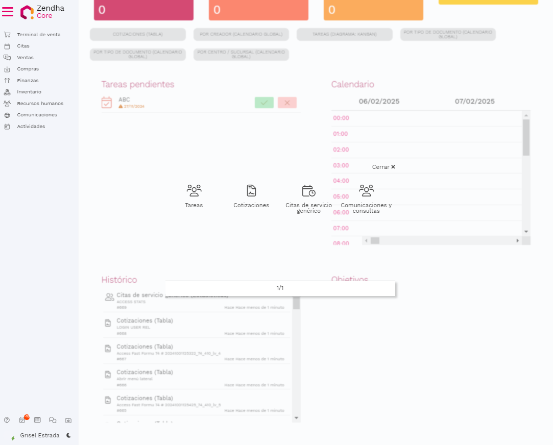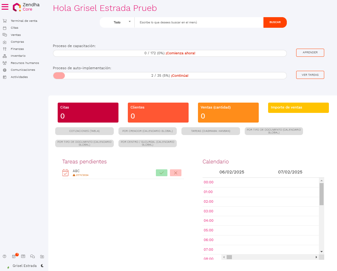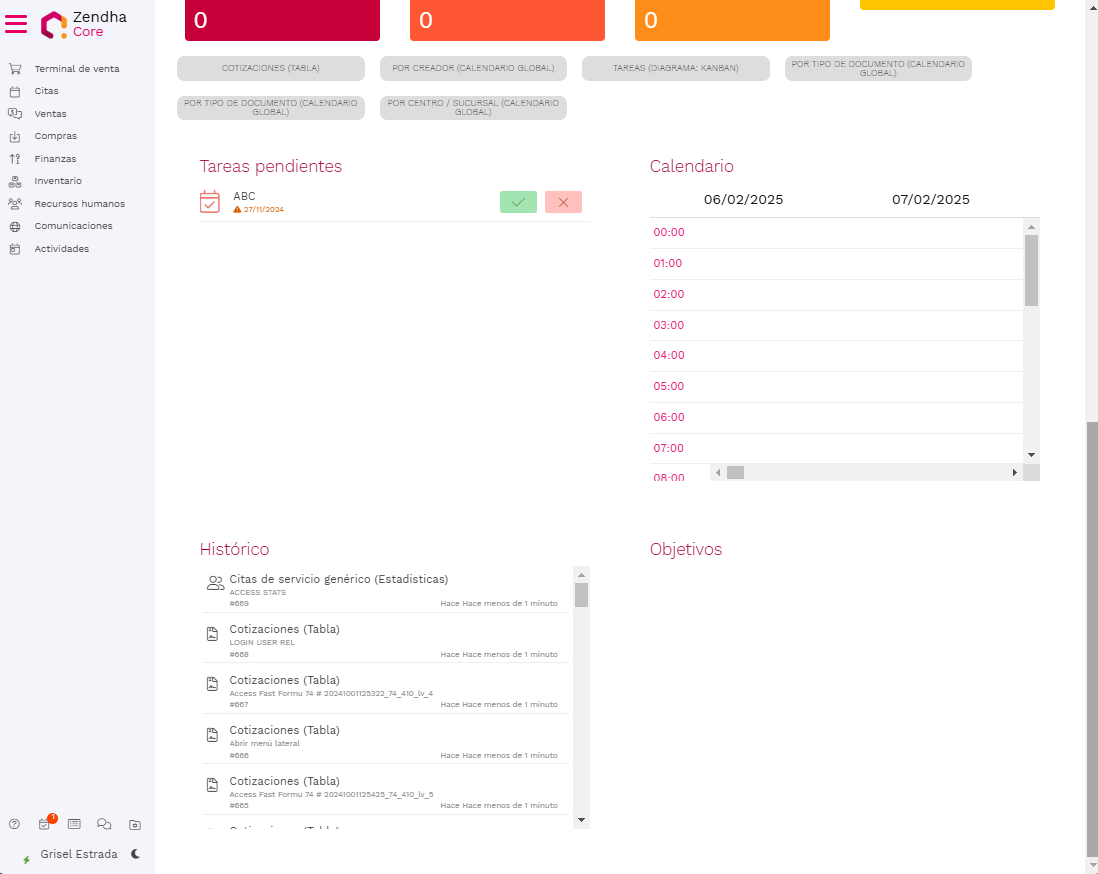 Esta es la primera pantalla que visualizarás al ingresar a Zendha Core. Funciona como tu panel principal, donde podrás consultar tus tareas, pendientes, calendario, indicadores clave (KPIs) y el registro de actividades. Es tu centro de control para comenzar el día.