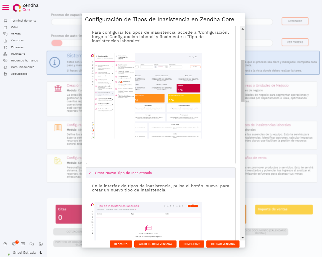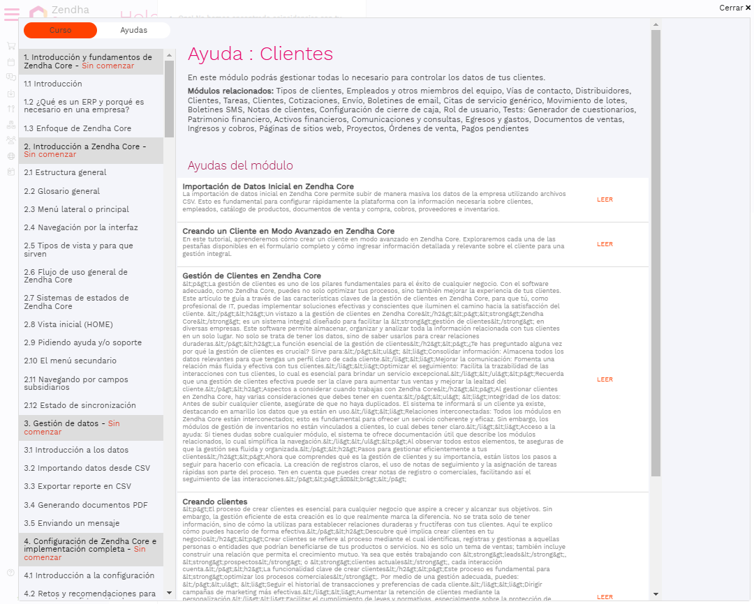 Si damos clic, se abrirá la misma vista del botón 'Ayuda' (ubicado abajo a la izquierda en el menú latreral izquierdo). Mostrando del lado izquierdo los manuales para el auto-aprendizaje de Zendha Core. Además, esta barra reflejará nuestro progreso.