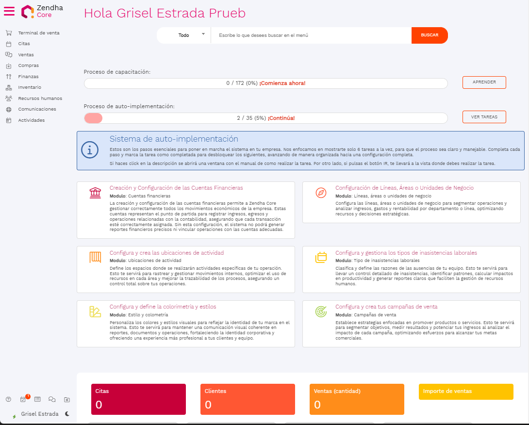Debajo del buscador, veremos un par de barras. La primera es el proceso de capacitación para aprender a usar Zendha Core adecuadamente.