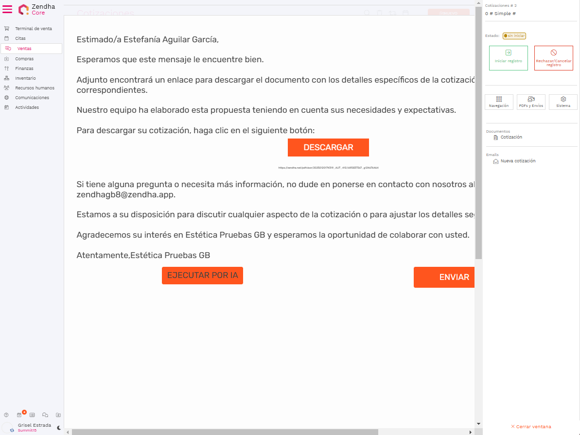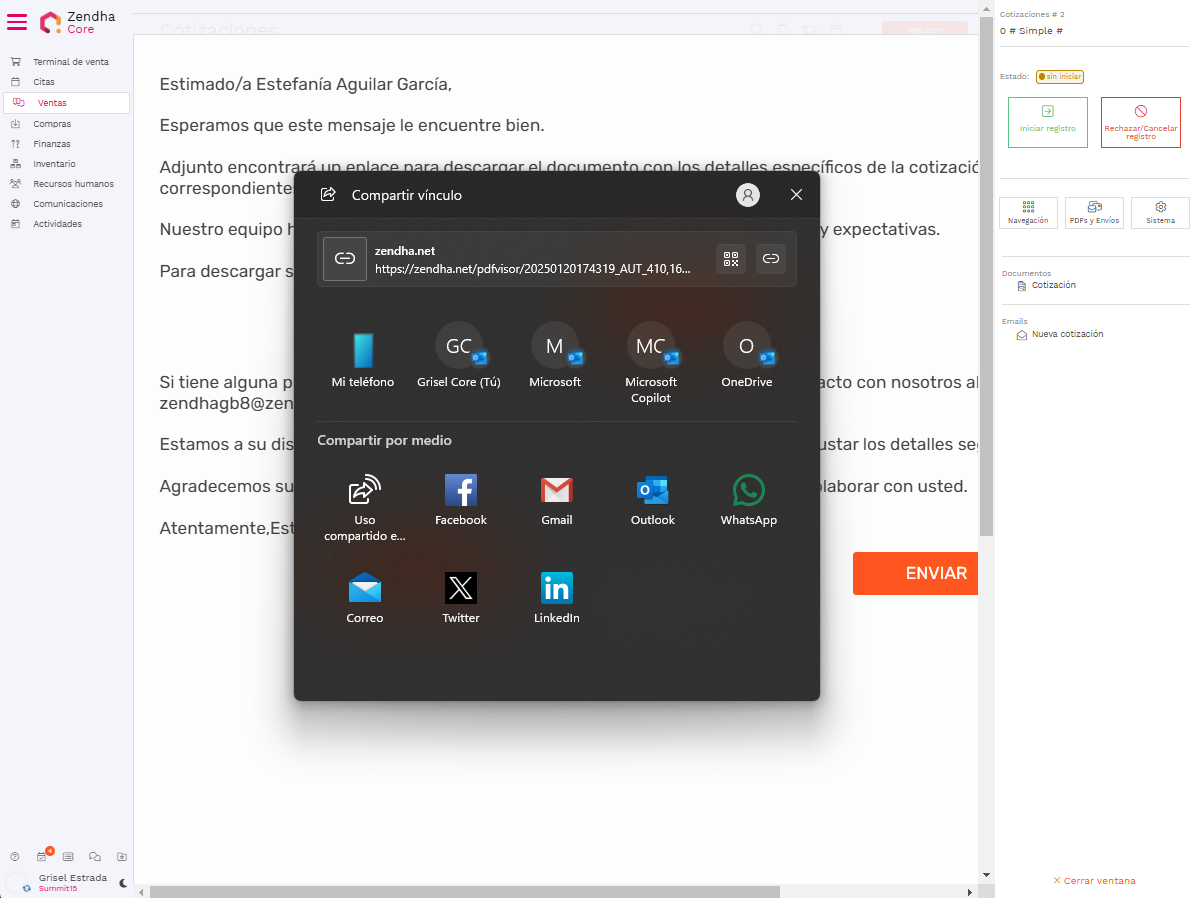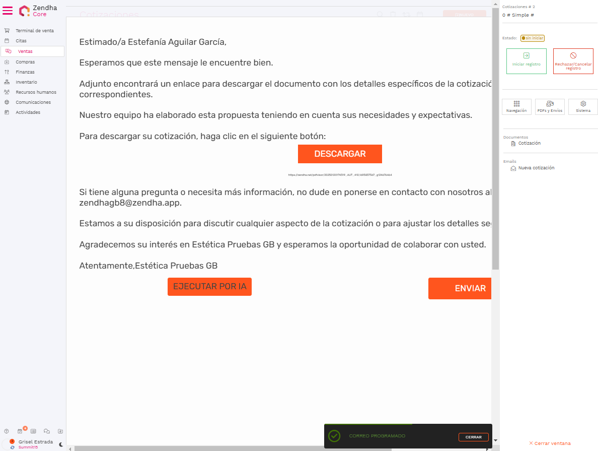 - Genera una vista previa: Al elegir el mensaje, Zendha Core te mostrará un avance del contenido a enviar.