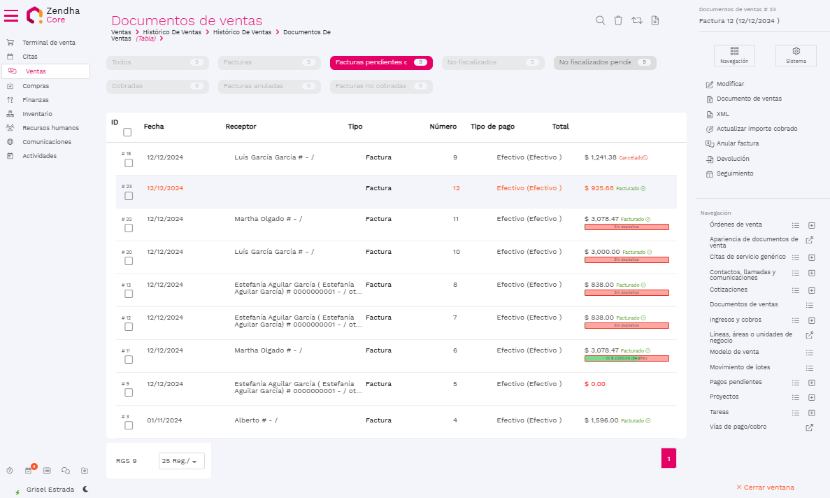 Zendha Core te permite manejar todas tus facturas de forma rápida y ordenada. Ya sea desde el histórico o directamente desde el cliente, puedes exportarlas en PDF o XML según lo que necesites.