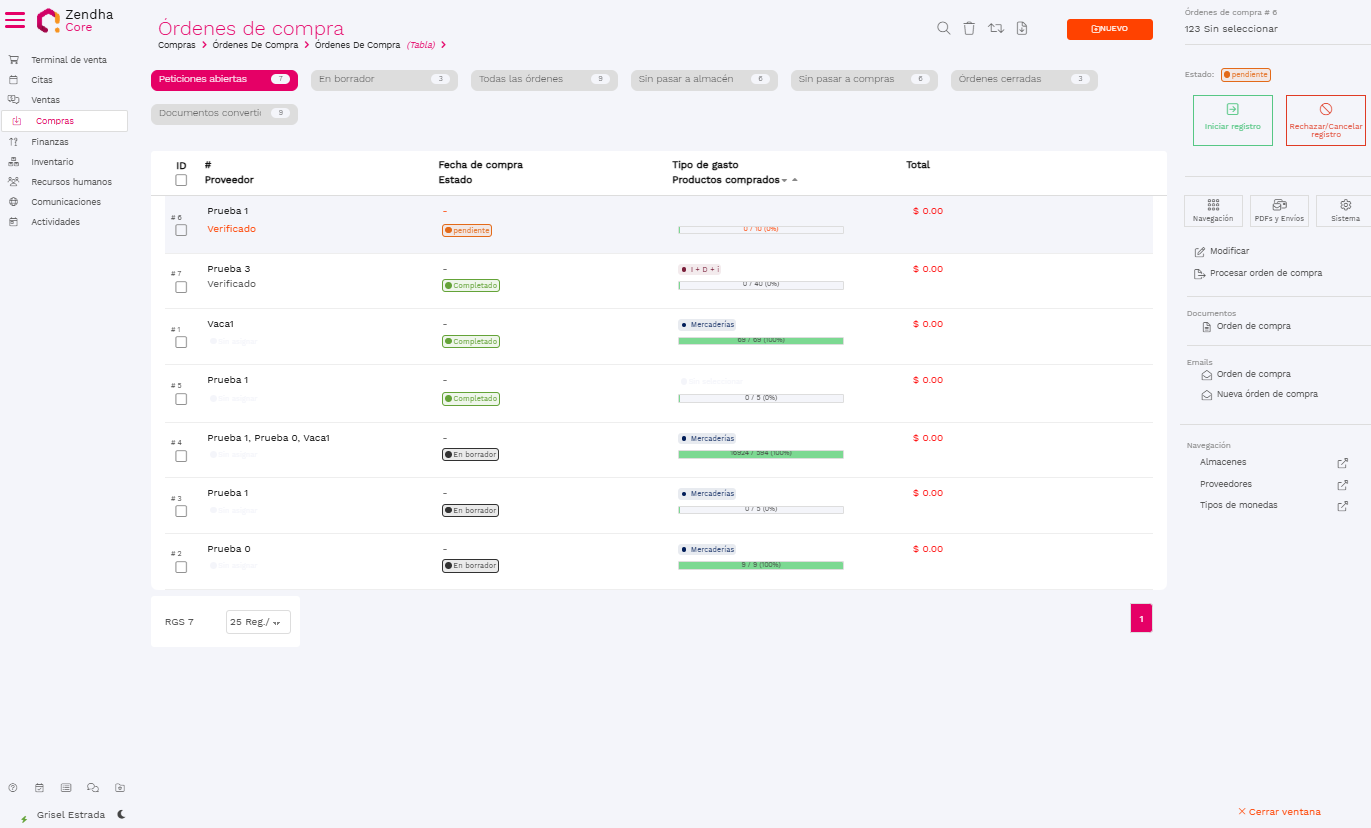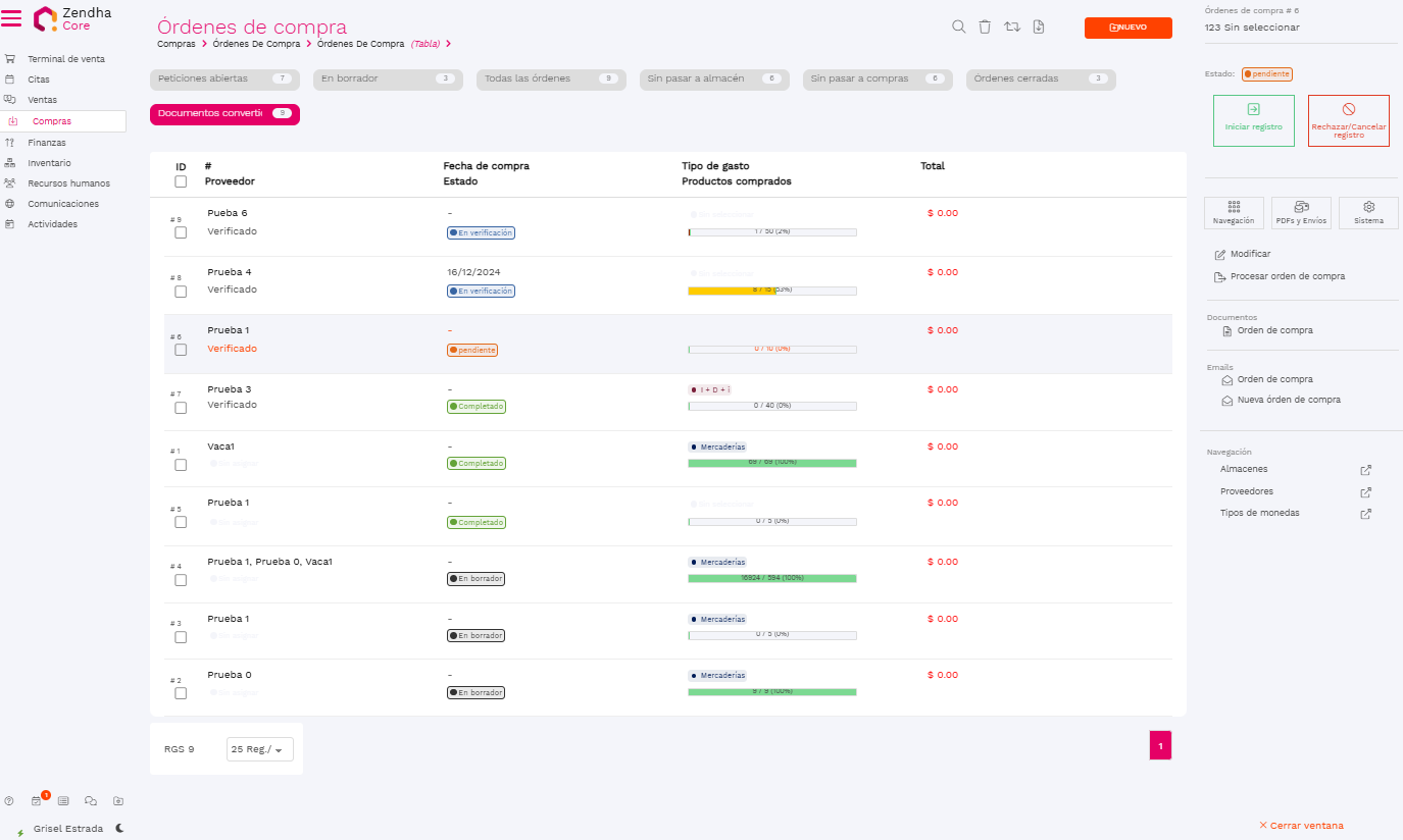 El módulo de órdenes de compra en Zendha Core está organizado en pestañas que agrupan las órdenes según su estado operativo: